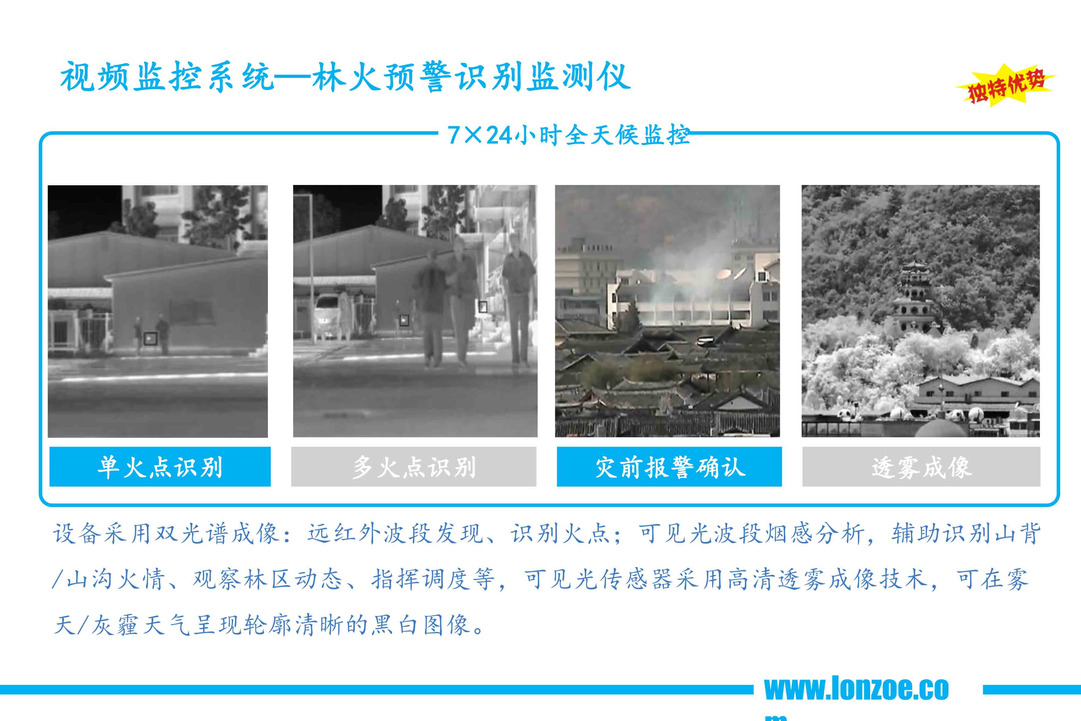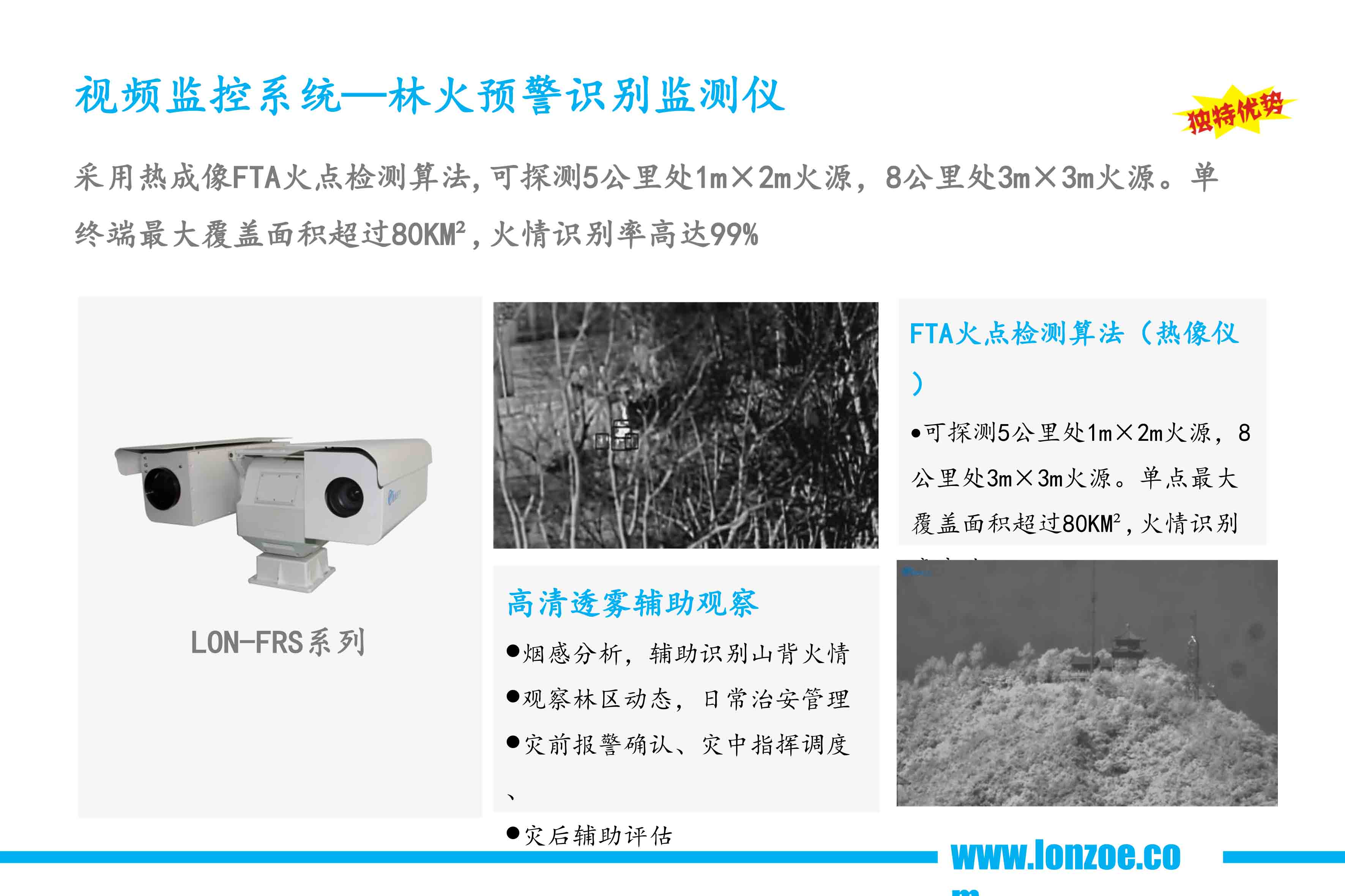 圖像更清晰,能更準(zhǔn)確的發(fā)現(xiàn)溫度異常,可自動(dòng)捕捉高溫區(qū)域,發(fā)現(xiàn)火點(diǎn)并自動(dòng)報(bào)警,搭配可見光攝像機(jī)做為熱成像火災(zāi)探測(cè)的補(bǔ)充,實(shí)時(shí)觀察林區(qū)動(dòng)態(tài)或者對(duì)火點(diǎn)進(jìn)行確認(rèn)